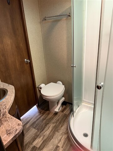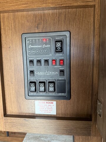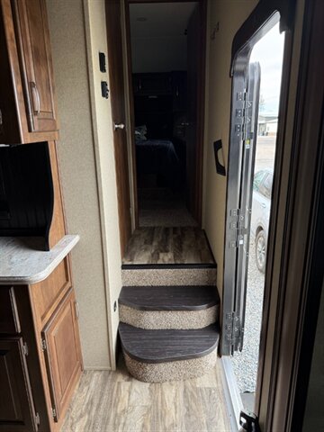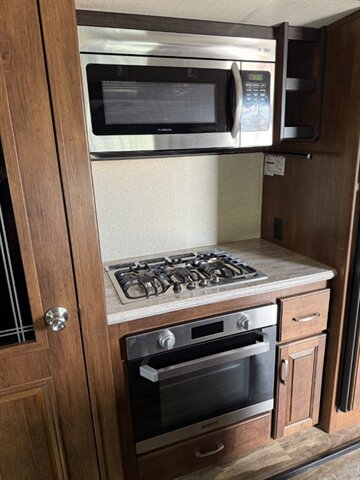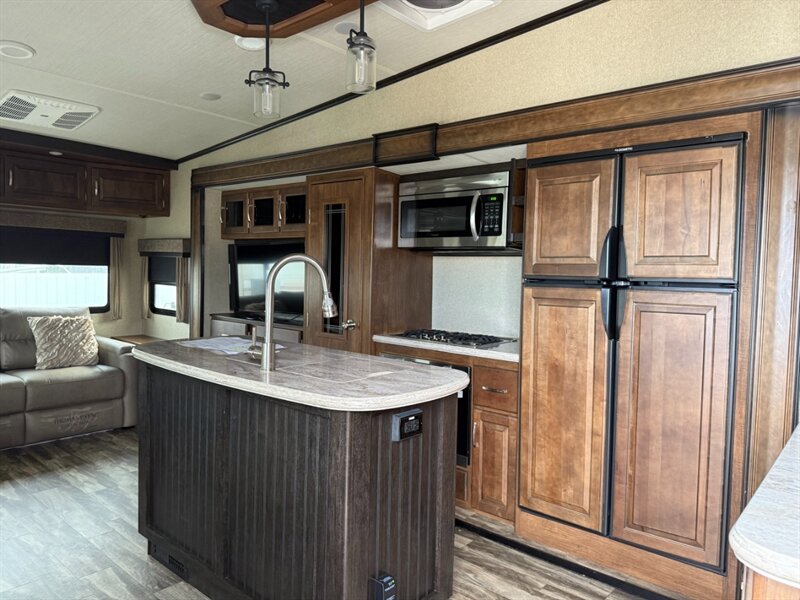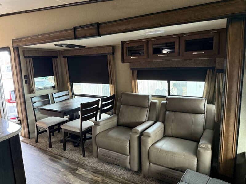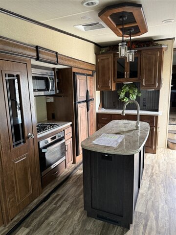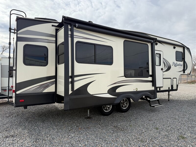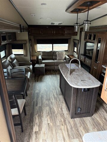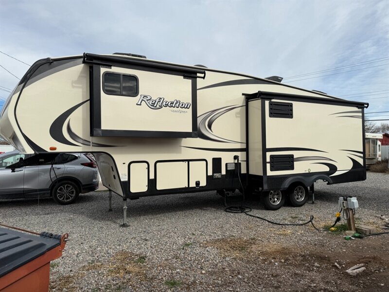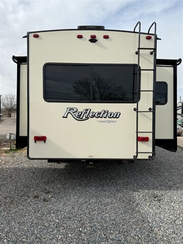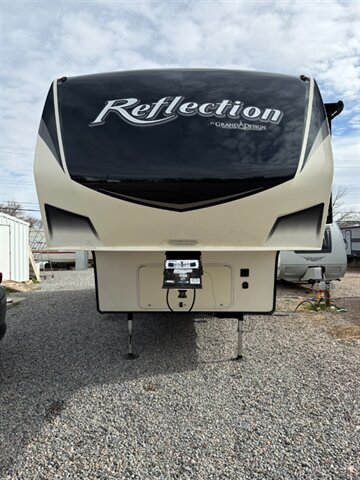 Pre-Owned 2019 Grand Design Reflection 303 RLS w/3 Slides has a queen walk around bed in front with good sized bathroom, mid kitchen/dining area with an island sink, large 4 door refrigerator, large pantry and lots of storage. Living area is located in rear which has a tri-fold sofa/bed, large flat screen T.V along with fireplace. This unit is equipped with self leveling system and much more. This like new unit is a must see with a dry weight of 9708 lbs.
